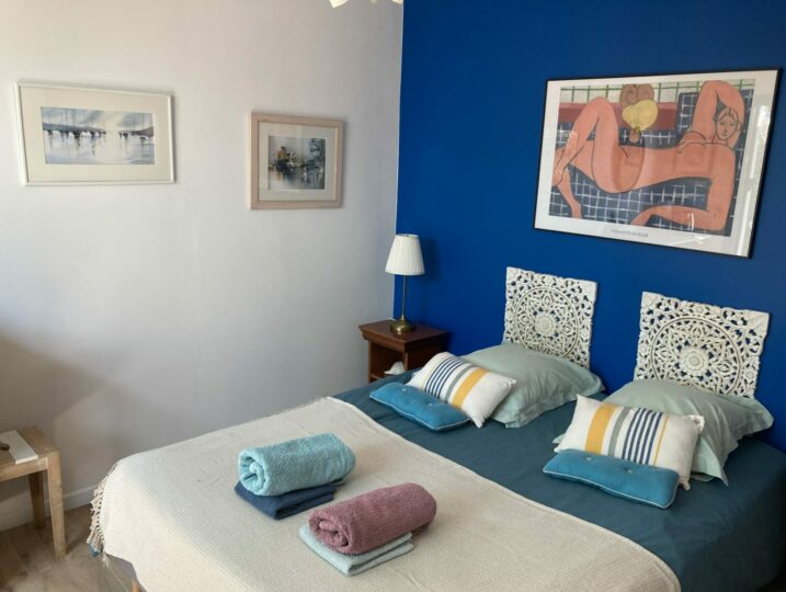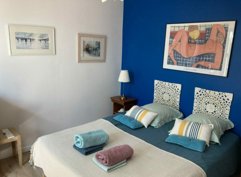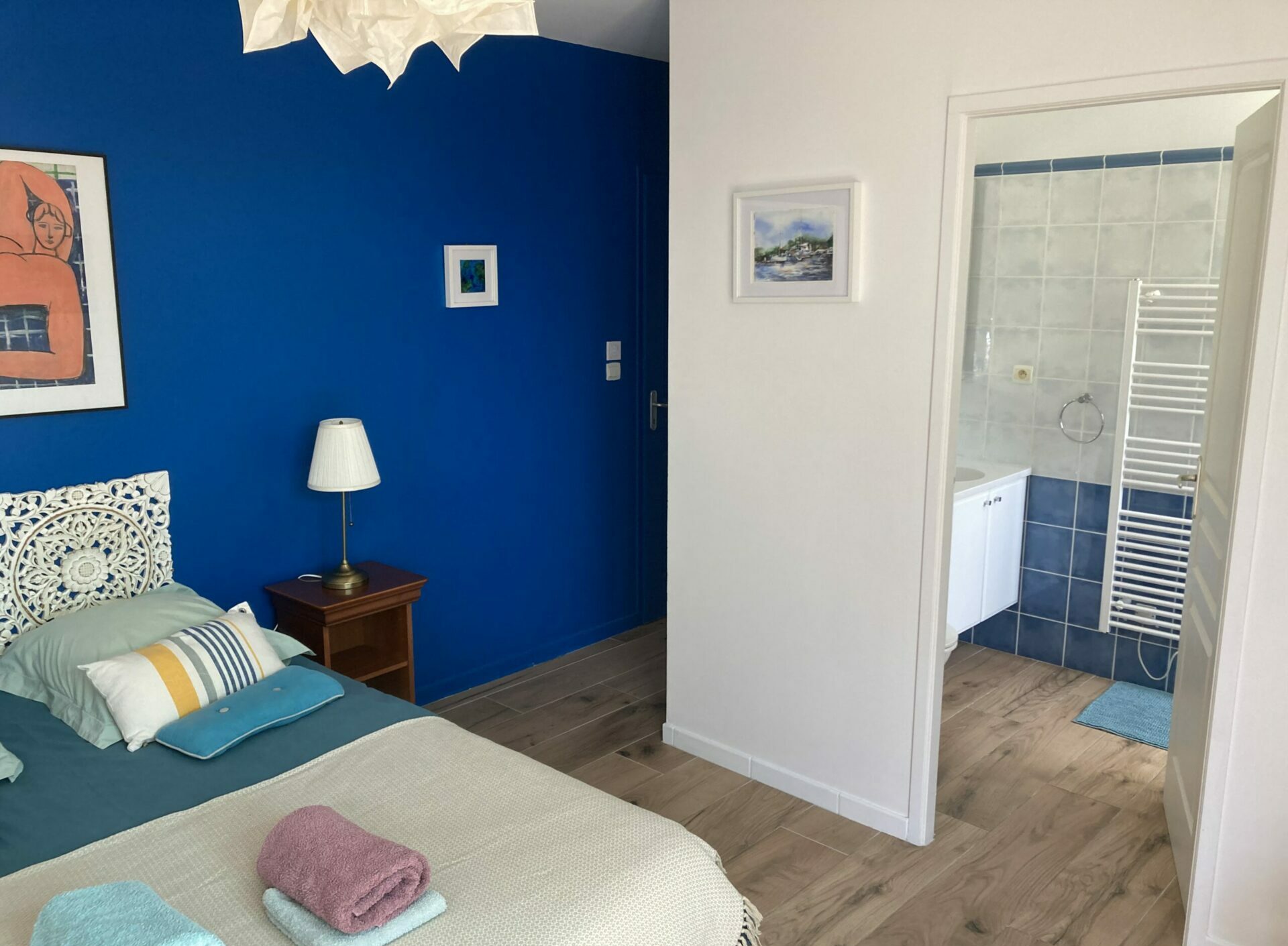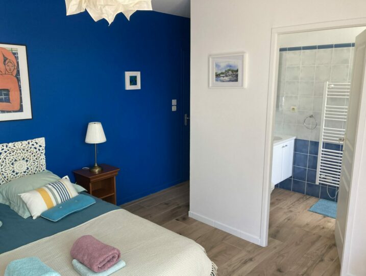 Sur la terrasse menant à la piscine avec une orientation sud, la chambre bleue dispose d’un lit de 160×200 et d’une salle d’eau avec toilettes, dans une ambiance reposante et cosy. Entrée indépendante depuis la terrasse.