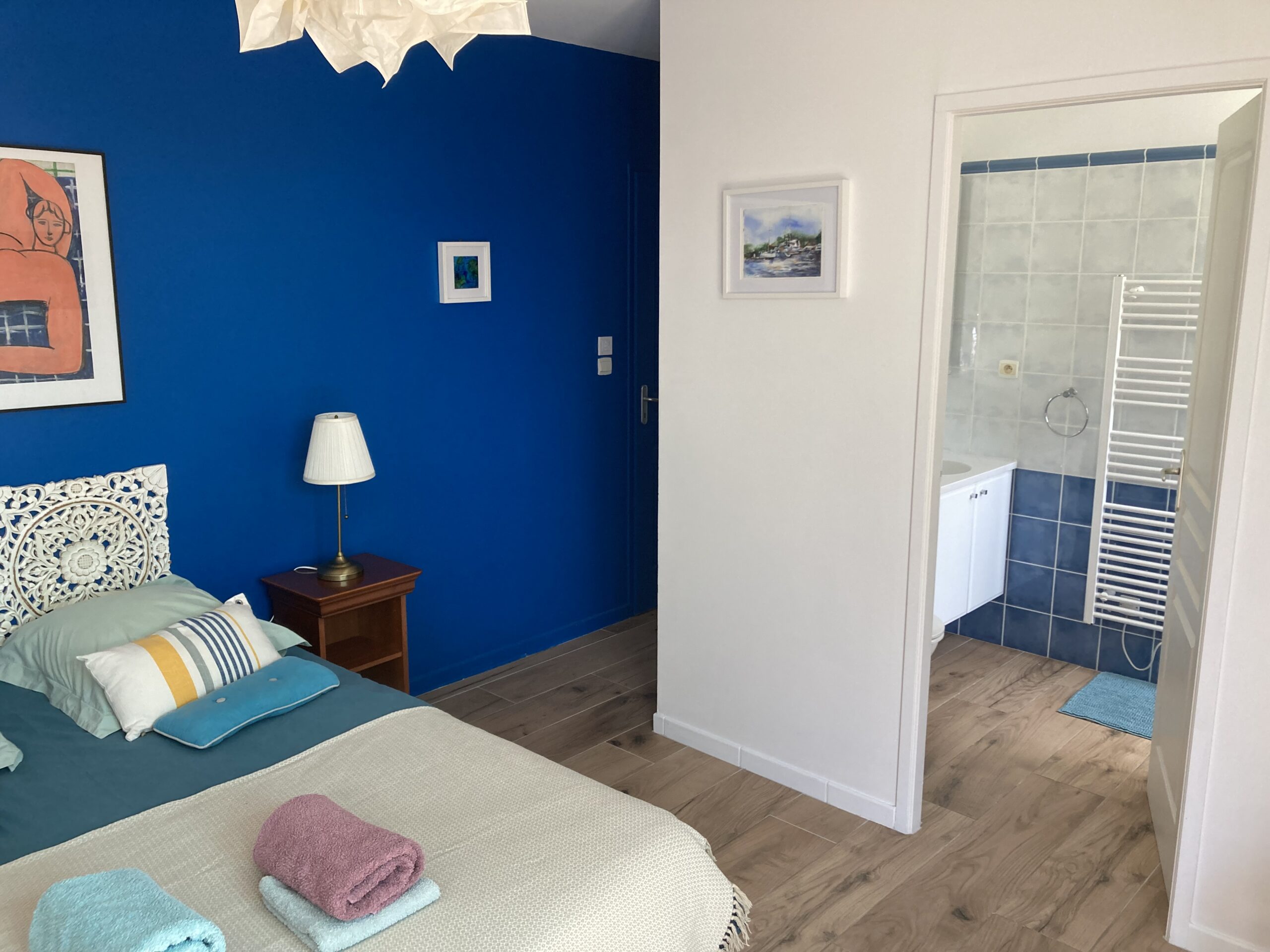 Sur la terrasse menant à la piscine avec une orientation sud, la chambre bleue dispose d’un lit de 160×200 et d’une salle d’eau avec toilettes, dans une ambiance reposante et cosy.