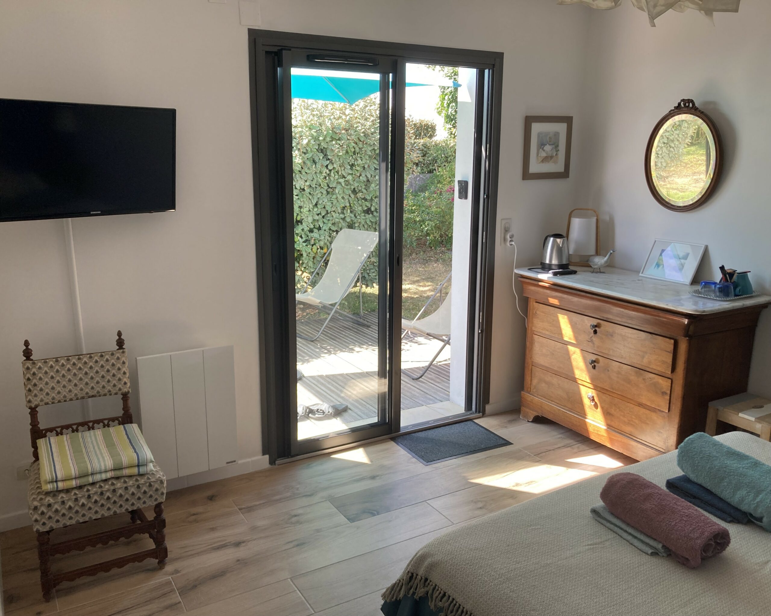 Les chambres disposent chacune d’une salle d’eau et de toilettes privatives. Elles bénéficient chacune d’une entrée indépendante depuis la terrasse ou le jardin, avec fauteuils, bains de soleil, petite table etc…                                                                              Et vous apprécierez les délicieux petits déjeuners préparés par Soizic.
